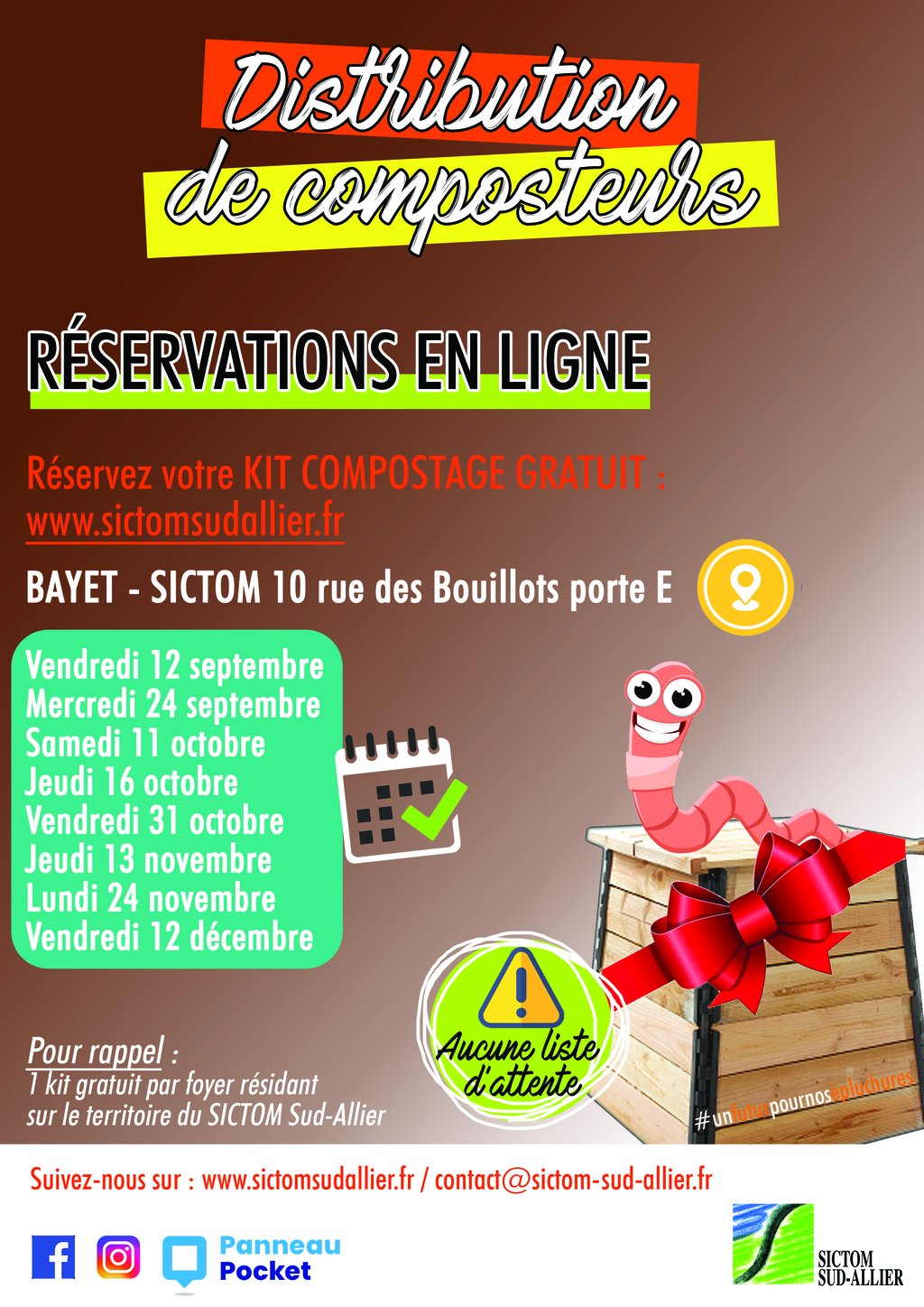 En PJ le visuel annonçant les dates des prochaines permanences de distribution de composteurs à BAYET.
