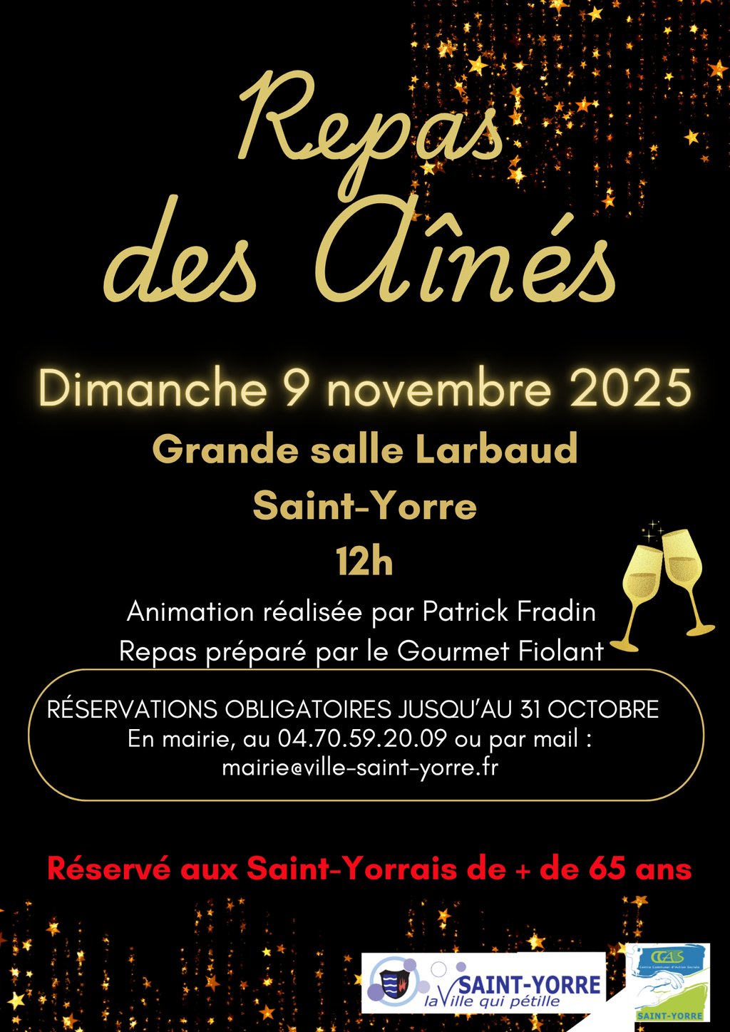 Mise à jour : pour les seniors Saint-Yorrais de plus de 65 ans, vous avez maintenant jusqu'au 31 octobre pour vous inscrire au Repas des Aînés 🥂