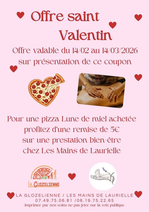 Vous pouvez faire durer le plaisir en dégustant une pizza Lune de Miel avec mon partenaire La Glozelienne  et bénéficier de 5€ de remise sur une prestation bien-être de votre choix chez Les Mains de Laurielle 03 sur présentation du coupon ci dessus.
